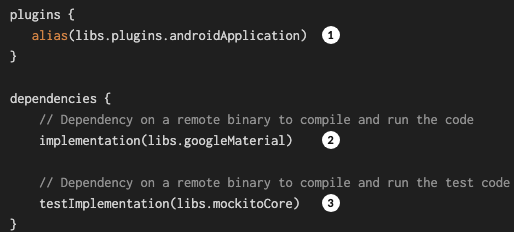 - libs.plugins.androidApplication: 버전 카탈로그 파일에서 plugins 항목에 androidApplication의 의존 정보를 들고 온다는 의미입니다.
