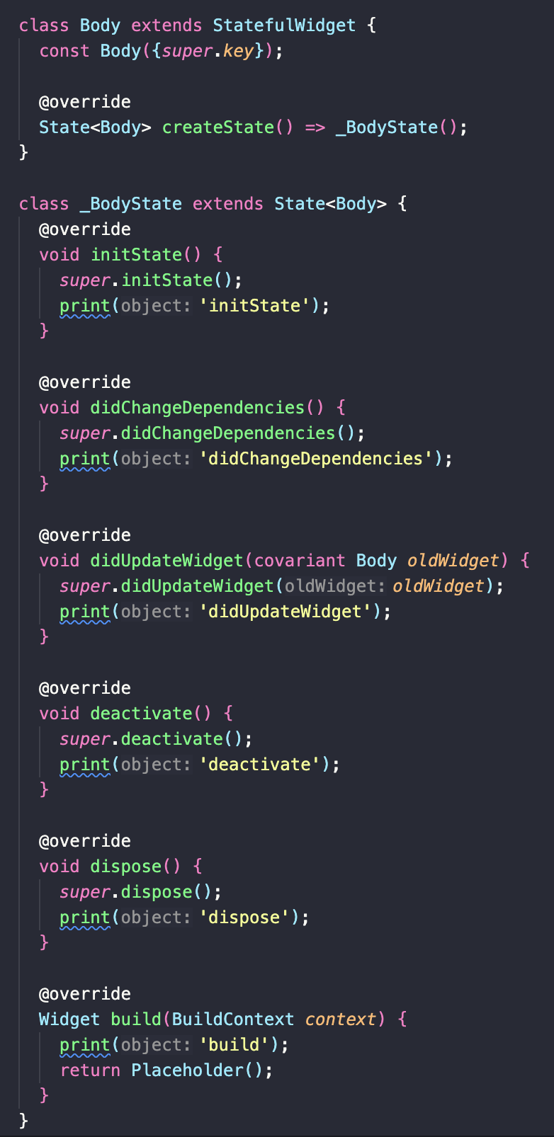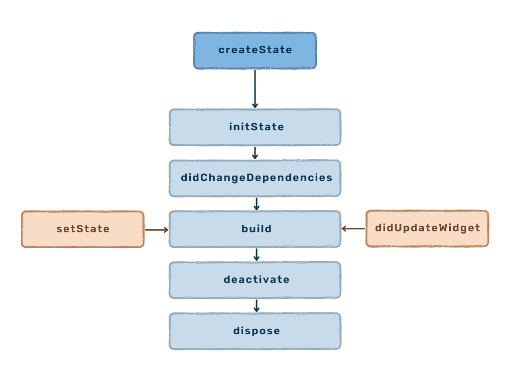 StatefulWidget(스테이트풀 위젯) 의 라이프 사이클에 대해 알아보도록 하겠습니다. 라이프 사이클과 함께 각 사이클에서 호출되는 훅 메소드도 알아보도록 하겠습니다. StatefulWidget의 라이프사이클